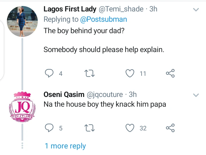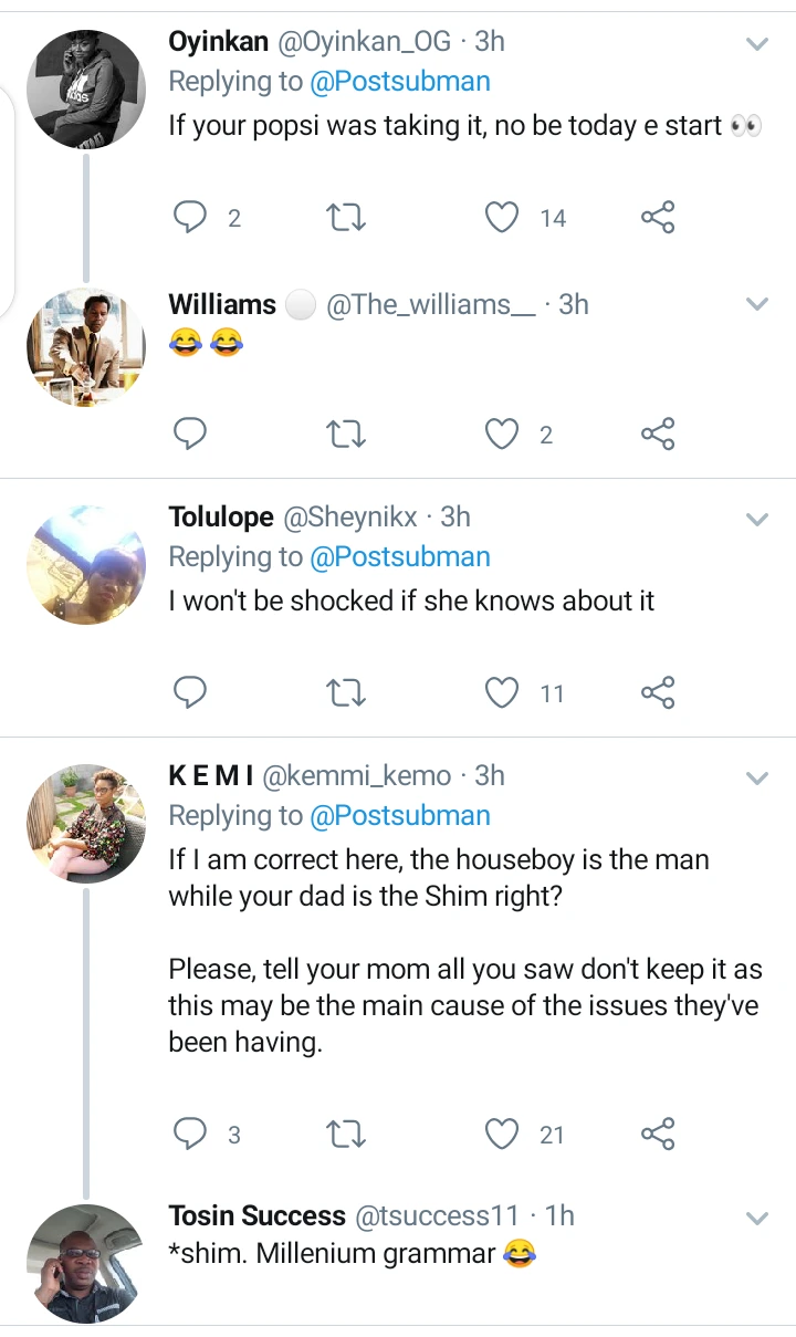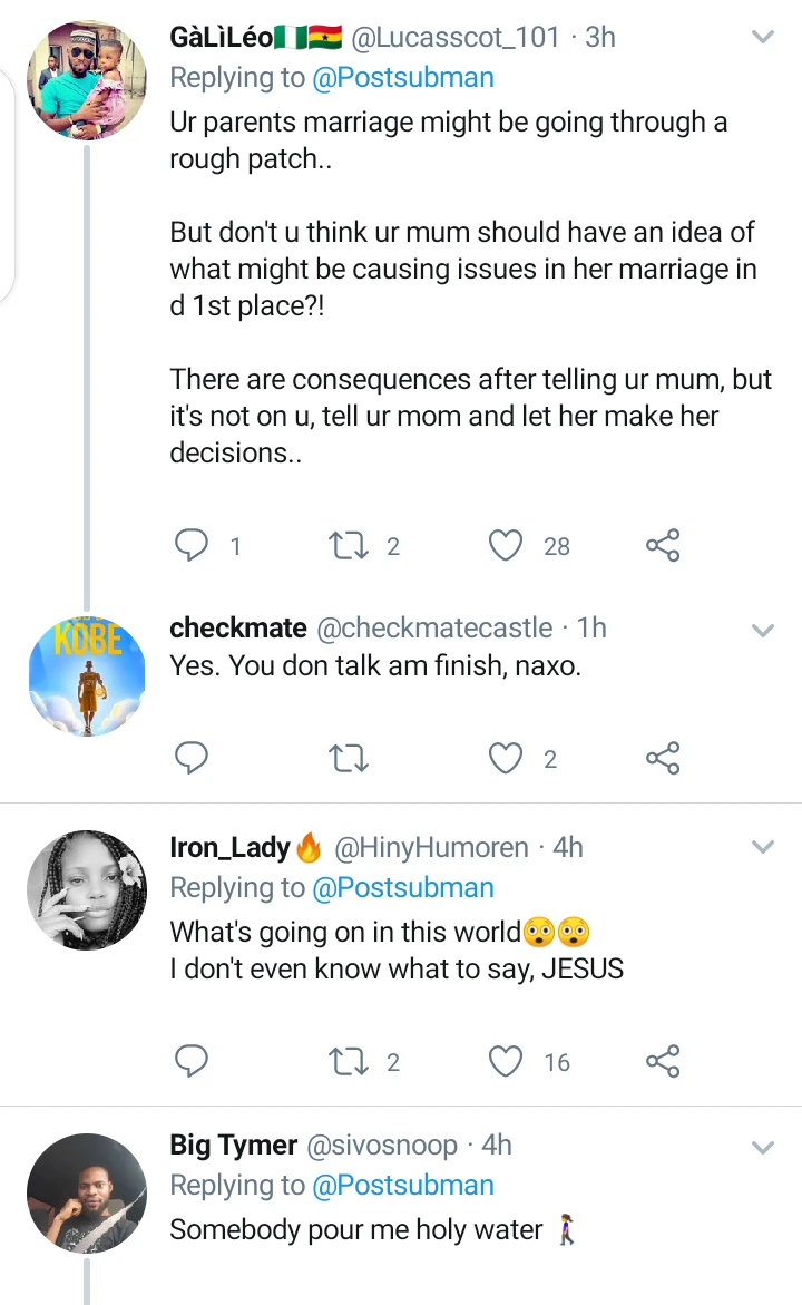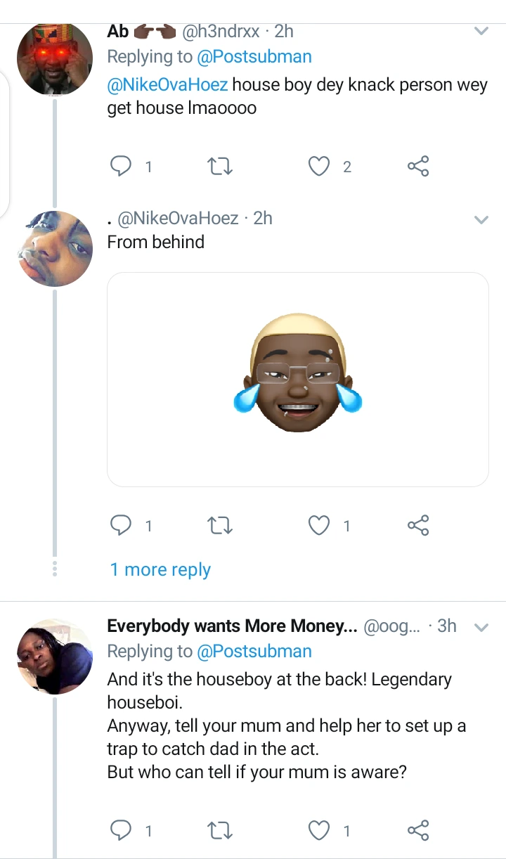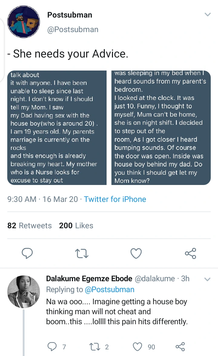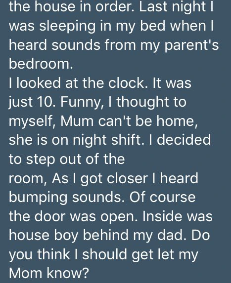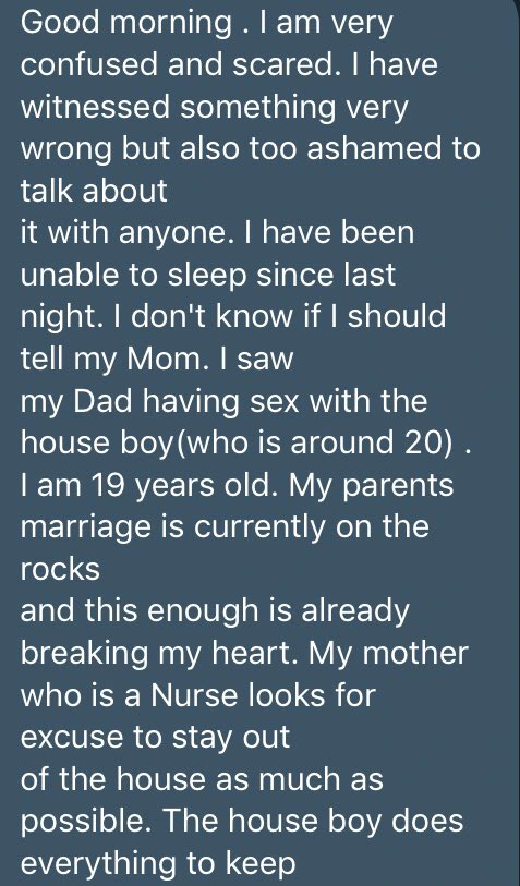 This particular lady begged to be anonymous and is asking for what she should do, she saw her Daddy in a doggy style collecting it from their 20year old Houseboy. The Lady is 19 and she said her parents marriage has hit the rock already, the Mom always find reasons to not come home since she is a nurse.