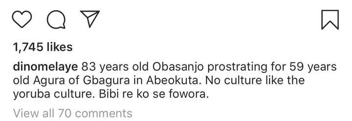 83 year old Obasanjo prostrating for 59year old Agura of Gbagura in Abeokuta. No culture like the Yoruba culture. Bibi re ko se fowora.”