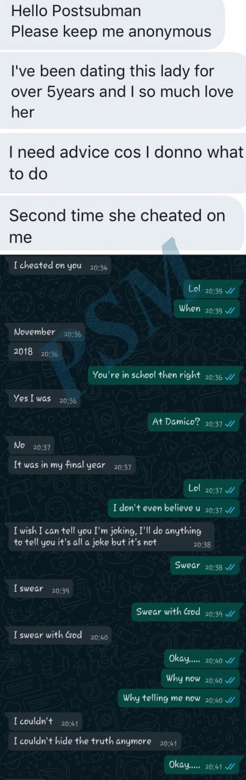 a Heartbroken young man took to twitter to seek for advice after he revealed that his girlfriend of five years cheated on him twice , he States that he is confused as he loves the girl and doesn't know what to do. He posted chats of him with his girlfriend who confessed openly via text that she cheated on him twice with her neighbour and her neighbours brother back in 2018 . The young man by name Abayomi thought he was joking but she clearly insisted she wasnt joking