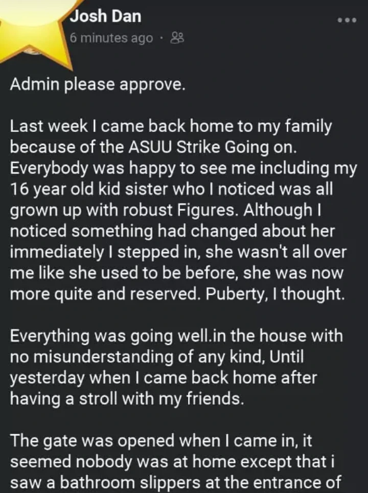 An unknown Student distinguished as Josh Dan who for Sensitivity asked that his Picture Not be indicated has Just taken to a Relationship blog on Social Media called Expert Advice to share his Story on how he discovered his younger sibling doing what he called 'the loathsome' in their folks room during his Visits to the house due to ASUU Strike.