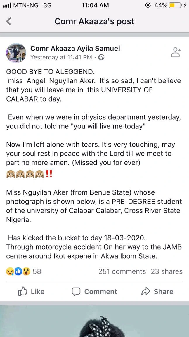 The Family Of Miss Aker Nguyilan has been thrown into mourning over the death of their young and beautiful daughter Aker who was involved in an accident on her way to go write her Joint Admission Matriculation Board Exam. It was gathered that she is a Pre degree student of University of calabar and was heading towards Ikot Ekpene to write her Jamb Exams when she was involved in a Bike Accident killing her instantly.