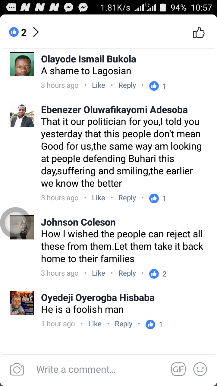 Ebenezer Oluwafikayomi Adesola said, "That is our politician for you, I told you yesterday that this people don't mean Good for us, the same way am looking at people defending Buhari this day, suffering and smiling, the earlier we know the better."